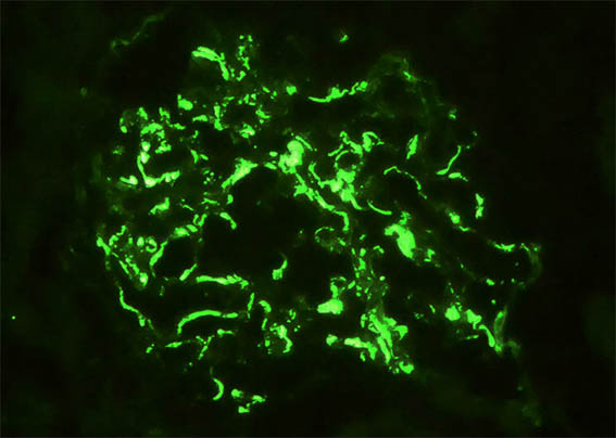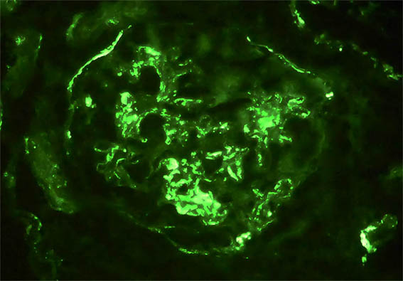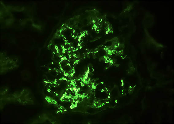 Direct immunofluorescence for IgG and C1q: Negative; kappa y lambda: similar staining to that of IgA and IgM. C4d: Negative.