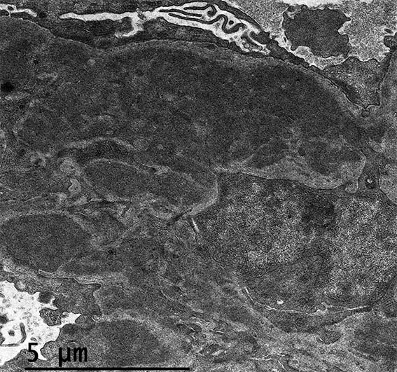 Figure 17. Electron microscopy, original magnification, X2.550. Mesangial electron-dense deposits.