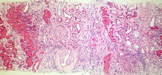 A 43-year-old man with end-stage renal failure of unknown cause, presumably glomerulopathy, was transplanted from a cadaveric donor. Adequate renal function during the first 2 years, with creatinine between 0.8 and 1.0 mg/dL. Immunosuppression scheme: prednisone, tacrolimus and mycophenolate, with adequate adherence and serum levels of tacrolimus within the expected therapeutic range. In a periodic control, the third year after the transplant, serum creatinine was elevated: 1.4 mg/dL, BUN: 27 mg/dL. Urinalysis with proteinuria: 300 mg/dL, microhematuria: 15-20 erythrocytes/hpf, some dysmorphic, leukocytes: 6-8/hpf; 24-hour urine protein: 2.6 g/24h. Infectious disease studies negative, normal complement. Resistance indices in graft vessels: normal.