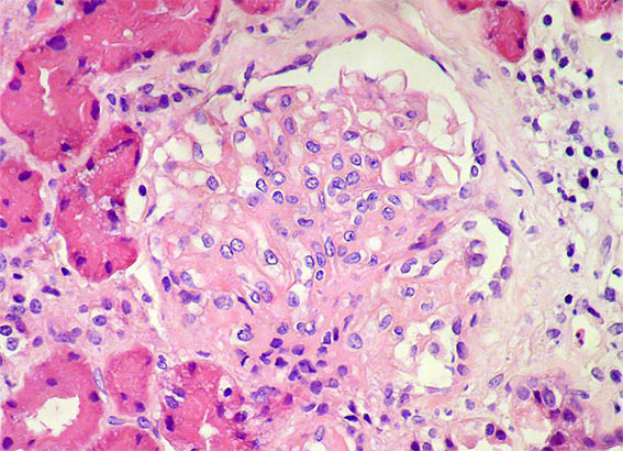 Figure 5. H&E, X400. Endocapillary hypercellularity (exudative) and a possible cresent.