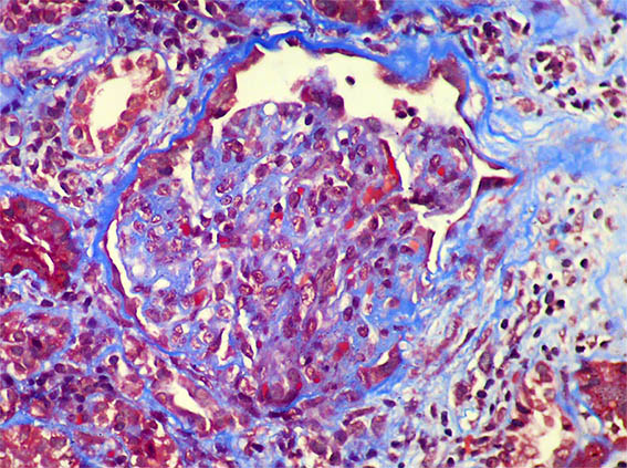 Figure 7. Masson's trichrome stain, X400. Mesangial expansión; normal artery.