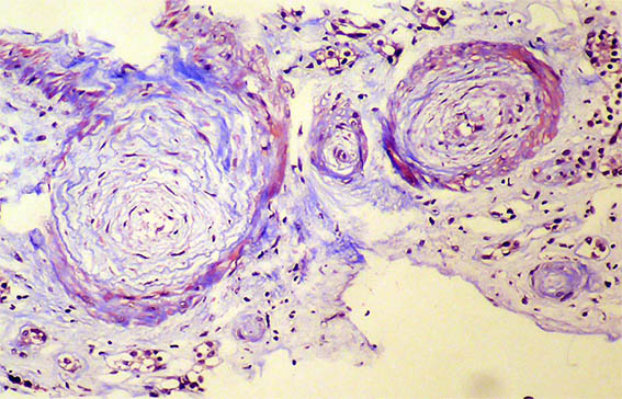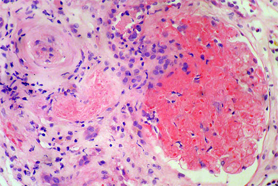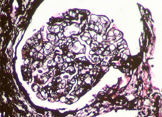 Paraclinical tests: normal blood leukogram, platelets 180,000/mm2. Serum creatinine: 2.1 mg/dL, BUN: 39 mg/dL. In urinalysis: proteinuria: 200 mg/dL, in the erythrocyte sediment: 10-15/high power field. ANAs: 1:80, C3: 86 (90-180), C4: 14 (12-40), anti-DNA: negative. ANCAs: negative.