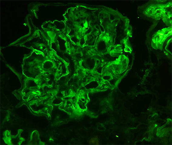Paraclinical tests: normal hemoleukogram; serum creatinine: 1.3 mg/dL, BUN: 18 mg/dL. Hepatotropic viruses and HIV negative. Glycosylated hemoglobin (HbA1c): 5.5%. Negative or normal autoimmunity studies; Protein electrophoresis without monoclonal spike.