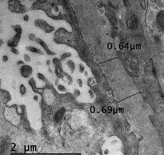 Figure 12. Electron microscopy, original magnification, X4,000. Diffuse thickening of the GBM.