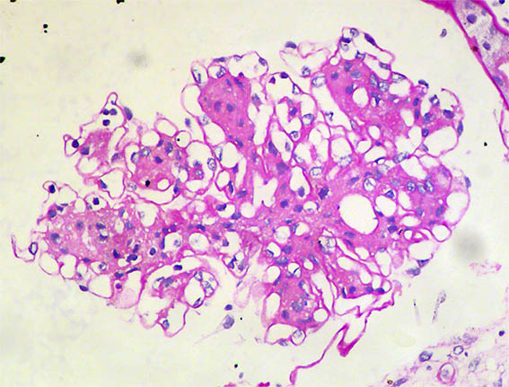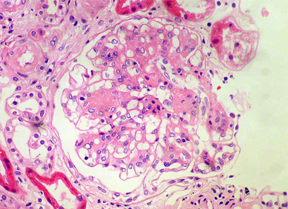 Figure 2. H&E, X400. Notable mesangial hypercellularity and glomerulomegaly.