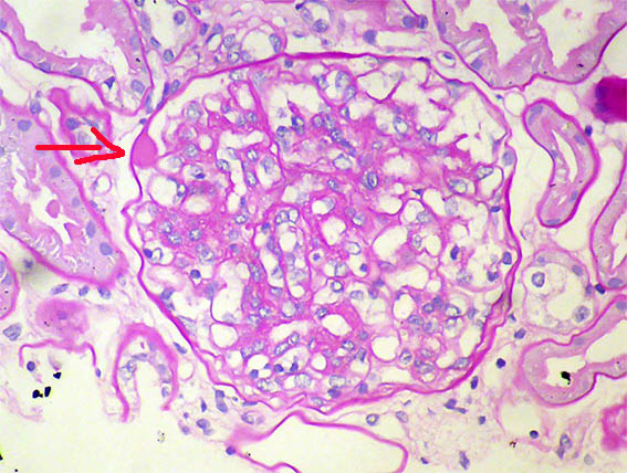 Figure 8. PAS, X400. Capsular drop (arrow).