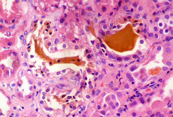 Direct immunofluorescence for IgA, IgG, IgM, C3, C1q, kappa and lambda: Negative. Iron stain: negative.