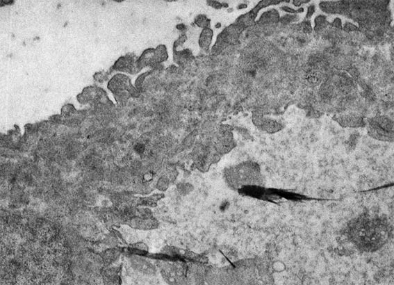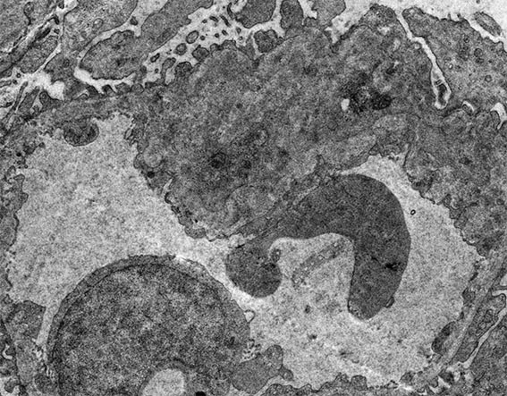 Figure 11. Electron microscopy, original magnification, X4,000. Note extensive podocyte damage, severe thickening of capillary walls, endothelial cell enlargement, and electron-dense subendothelial areas.