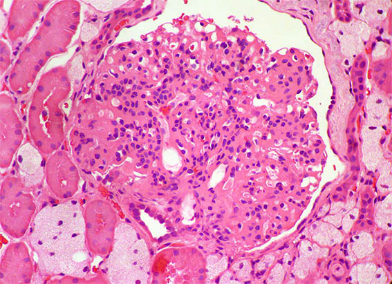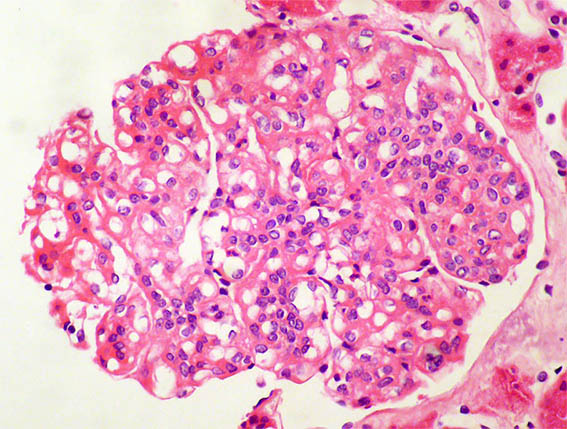 In paraclinical studies, normal hemoleukogram, serum cretinin: 1.8 mg/dL, BUN: 32 mg/dL, proteinuria 3.9 g/24h, sediment with 25 erythrocytes/CGA, without leukocyturia. Serum albumin: 2.4 g/dL. Dyslipidemia. ANAs and anti-DNA negative, C3: 22 mg/dL (88-180) C4: 16 mg/dL (15-40), virus studies negative, AELOS normal.