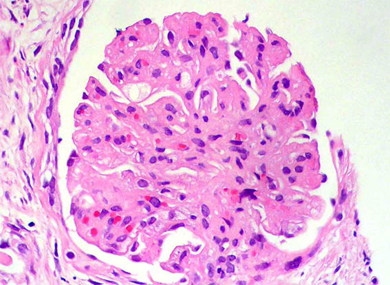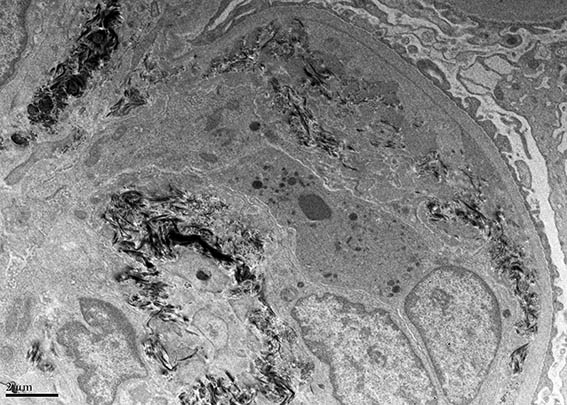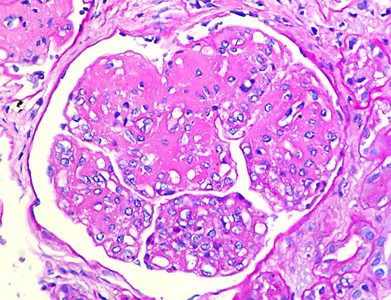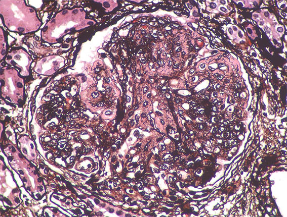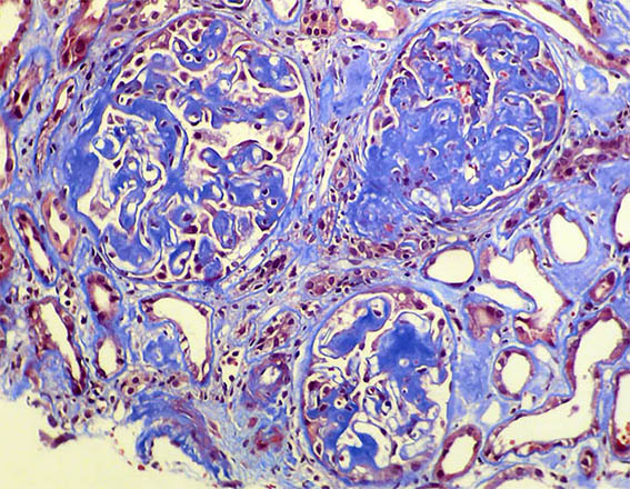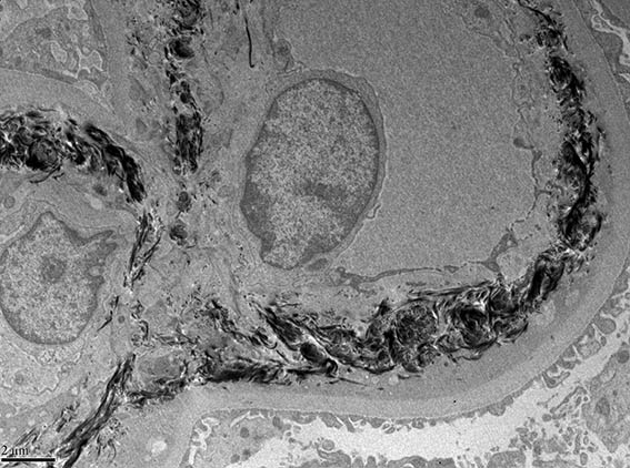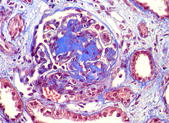 A 33-year-old man presented with pedal edema, persistent proteinuria and hypertension. Her past and family histories were unremarkable. Her blood pressure was 160/100 mm Hg. Physical examination revealed pedal and facial edema, without other alterations. Laboratory tests showed proteinuria of 4.7g/24 h, serum creatinine 1,0 mg/dL, microhematuria, normal serum complement levels, ANA negative; HIV, hepatitis B and C viral infections were negative. Ultrasound of the abdomen showed normal sized kidneys.