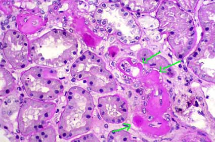 Toxicidad aguda: El principal cambio morfológico ocurre en los túbulos proximales: vacuolización isométrica de las células, definida como células con el citoplasma lleno de vacuolas pequeñas con aproximadamente el mismo tamaño, en algunos casos podemos encontrar también pérdida o atenuación del borde en cepillo; esta vacuolización predomina en la porción recta del túbulo proximal. La vacuolas son más pequeñas que el núcleo y son similares a las causadas por diuréticos osmóticos. Algunos autores han informado que en toxicidad por tacrolimus las vacuolas son un poco más grandes e irregulares. Se deben a dilatación del retículo endoplásmico. Como las otras lesiones de toxicidad por CsA, no es un hallazgo específico, sin embargo, en un contexto clínico adecuado permiten hacer el diagnóstico con relativa confiabilidad. A mayor cantidad de túbulos afectados mejor correlación con toxicidad, aunque con las dosis actuales no es usual encontrar afectación tubular extensa. También se han descrito mitocondrias gigantes (difíciles de ver con microscopía de luz), microcalcificaciones tubulares y lisosomas múltiples grandes.