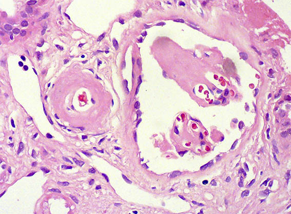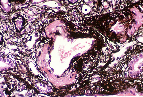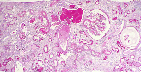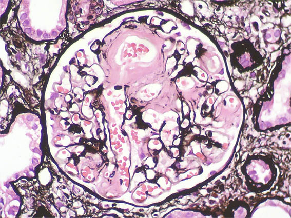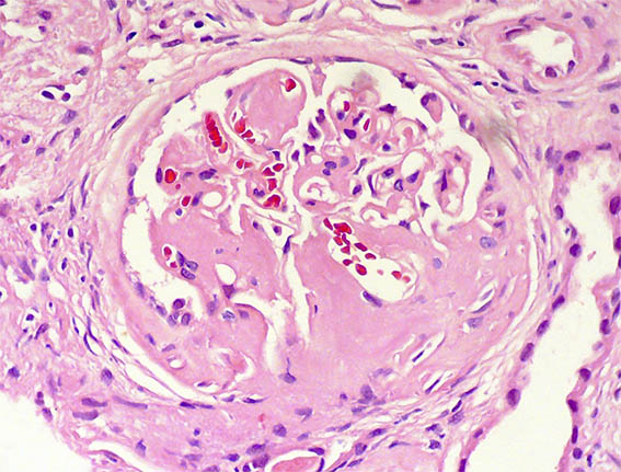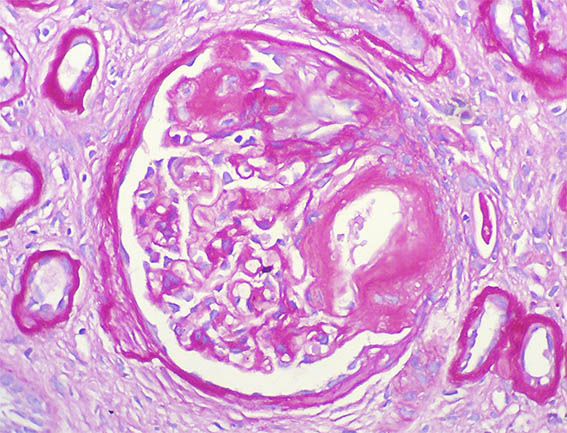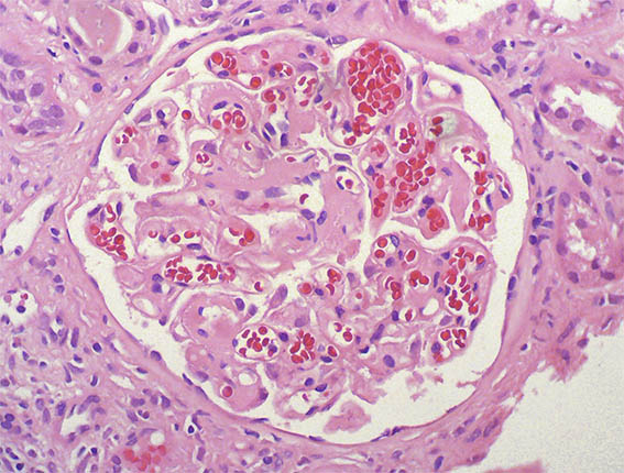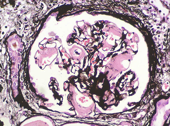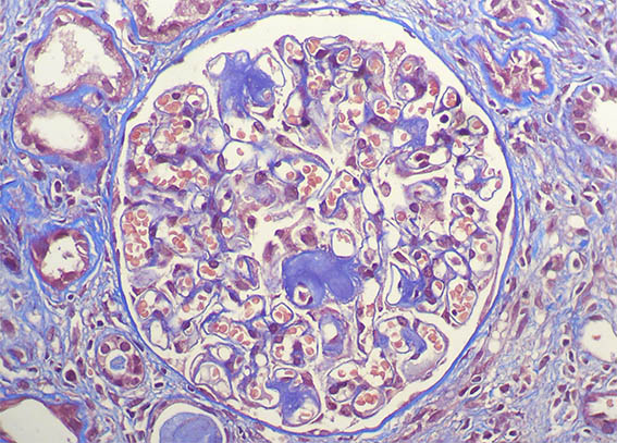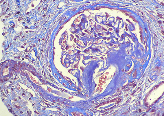 Leve anemia hipocrómica. Plaquetas y leucocitos en rangos normales. Creatinina sérica: 1,9 mg/dL, BUN: 28 mg/dL. Pruebas para virus hepatotropos y VIH: negativas. VDRL positivo, con FTA-ABS positivo para lúes. Pruebas de autoinmunidad negativas, complemento sérico normal. Proteinuria: 8,3 g/24h. Albúmina sérica: 1,7 g/dL; proteinas totales: 3,7 g/dL.