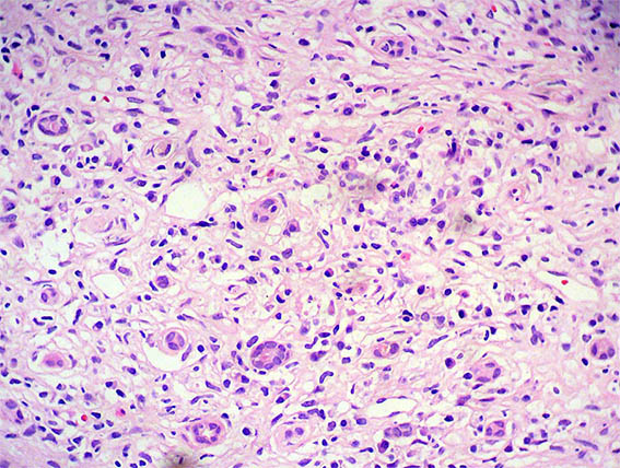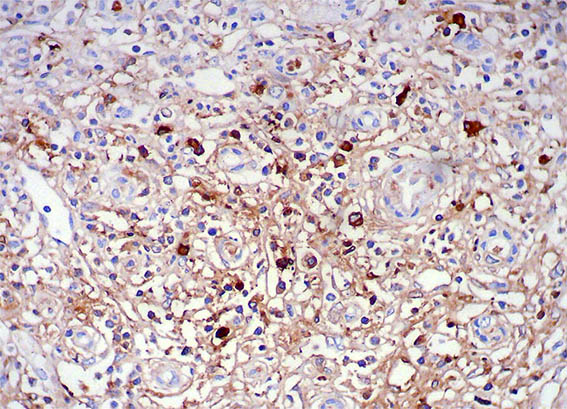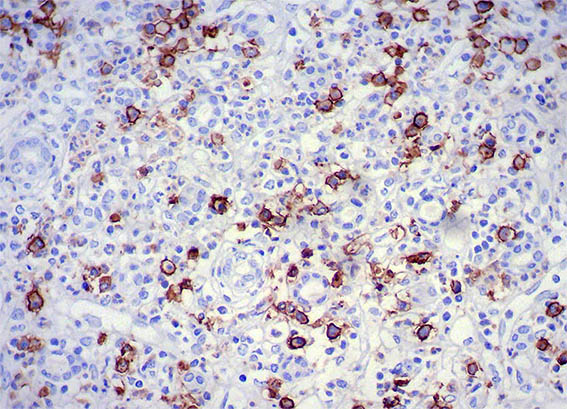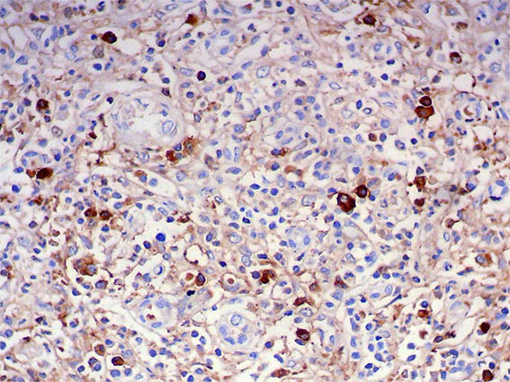 Figura 9. Inmunohistoquímica para IgG, X200. Abundantes células plasmática positivas para IgG, muchas de ellas IgG4: ver las imágenes 11 y 12.