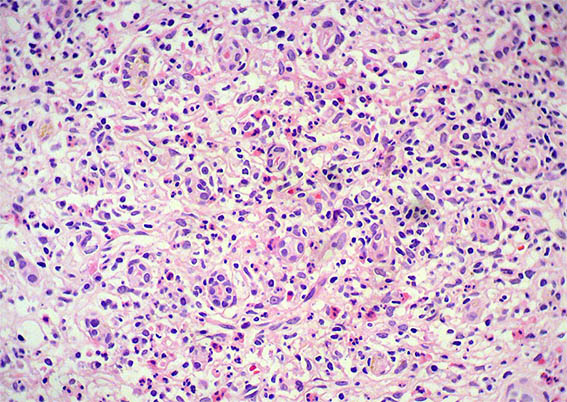 H&E, X400. Infiltrado intersticial de linfocitos, neutrófilos, eosinófilos y células plasmáticas.
