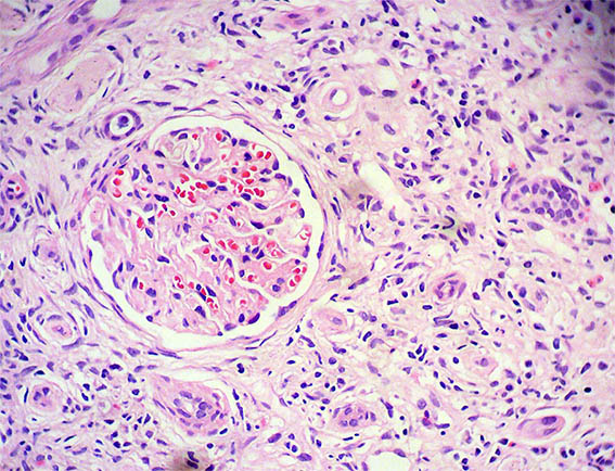 Figura 1. H&E, X100. Note el prominente compromiso tubulointersticial.