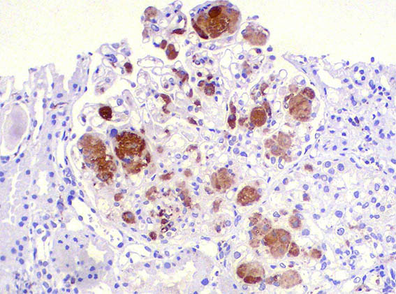 Figura 10. Inmunohistoquímica para CD68 (monocitos/macrófagos), X400. Además de las células positivas en glomérulos hay células intersticiales con características similares.