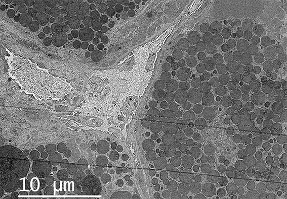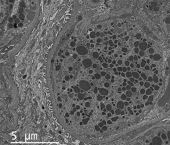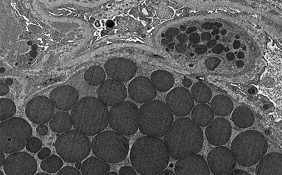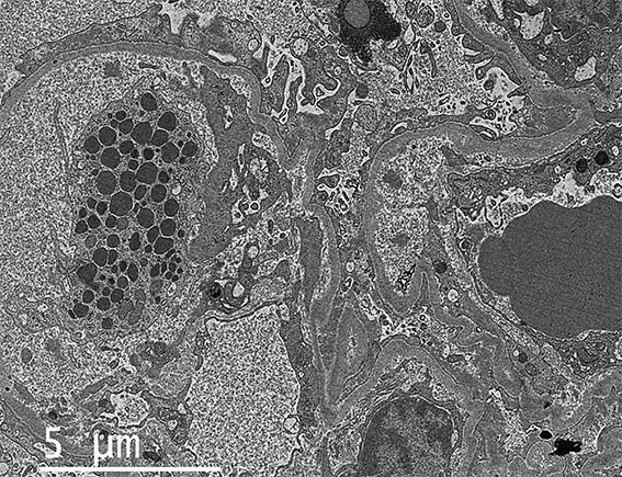 Figura 14. Microscopía electrónica, aumento original, X4.000. Los gránulos o cristales están en el citoplasma de células intracapilares.
