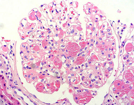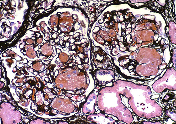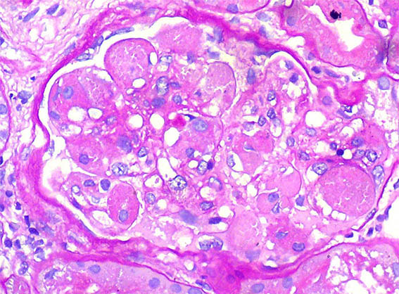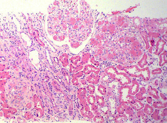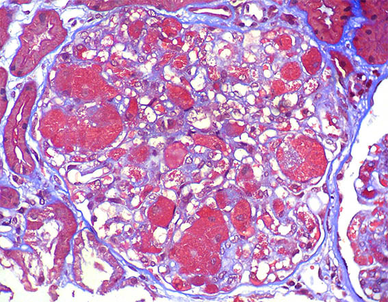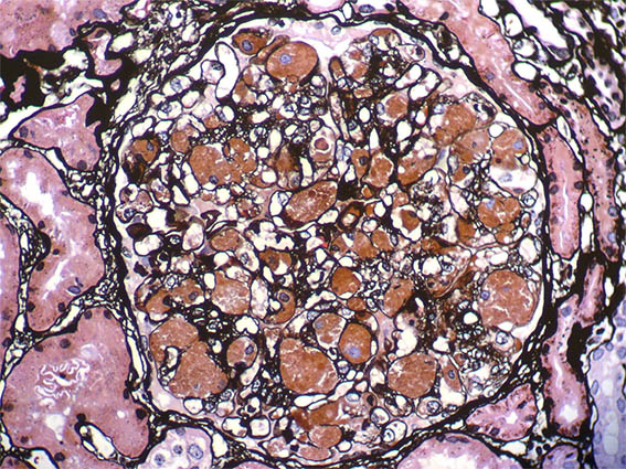 La paciente es una mujer de 56 años quien es evaluada por presentar edema de varias semanas de evolución. En los paraclínicos se documenta proteinuria nefrótica: 3,6 g/24h, creatinina 1,2 mg/dL; BUN 16 mg/dL. Estudios para virus y autoinmunidad negativos. Complemento normal. Albumina sérica: 3,1 g/dL. En el sedimento urinario: 8-10 eritrocitos /CGA, leucocitos 3/CGA, no informan cilindros.