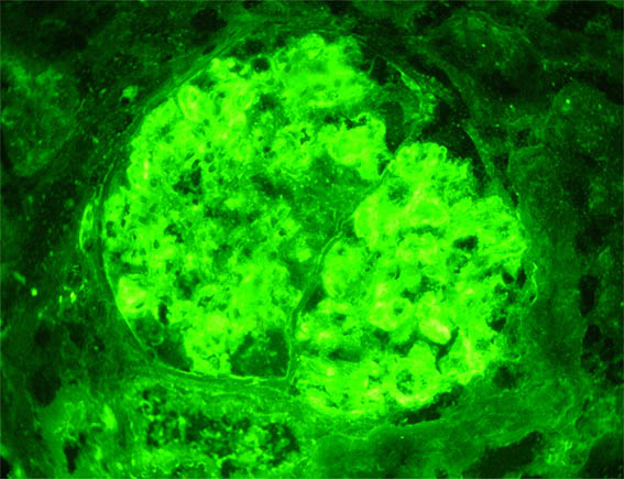 Figura 8. Inmunofluorescencia para cadenas ligeras kappa, X400.