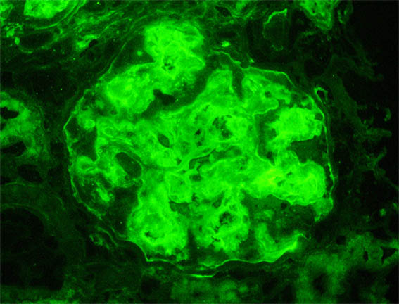 Figura 7. Inmunofluorescencia para IgG, X400.