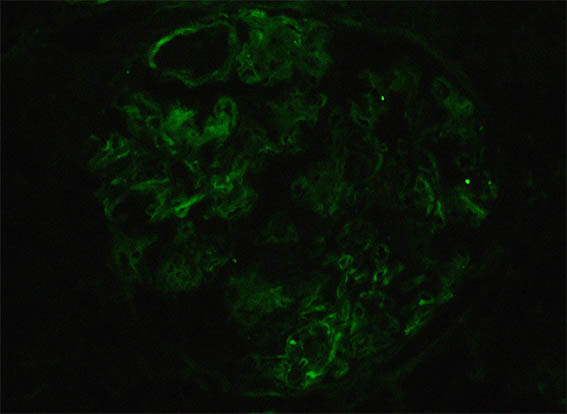 Inmunofluorescencia directa para IgA, IgM, C3 y C1q: Negativas.