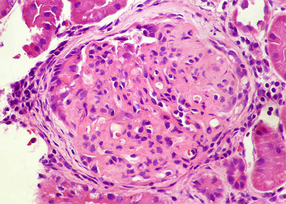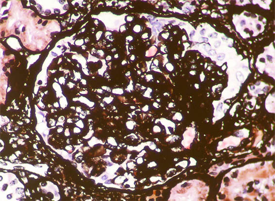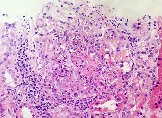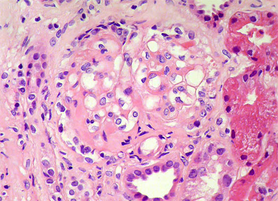 Figura 5. H&E, X400. Hipercelularidad endocapilar, exudativa, y una posible semiluna epitelial.