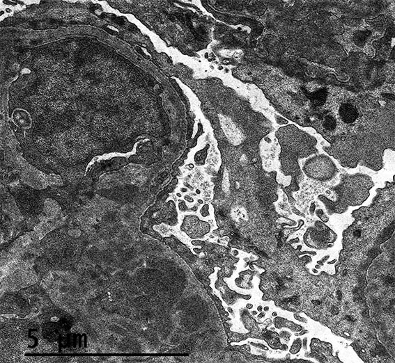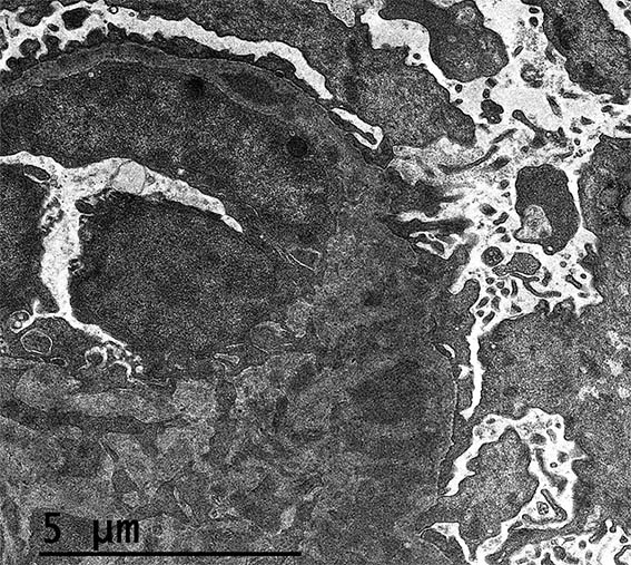 Figura 16. Microscopía electrónica, aumento original, X2.100. Depósitos mesangiales electron-densos y una luz capilar casi obstruida por una célula.