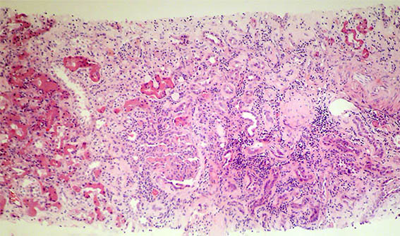 Un hombre de 43 años con insuficiencia renal terminal de causa desconocida, presumiblemente una glomerulopatía, fue trasplantado de donante cadavérico. Función renal adecuada durante los 2 primeros años, con creatinina entre 0,8 y 1,0 mg/dL. Esquema de inmunosupresión: prednisona, tacrolimus y micofenolato, con adecuada adherencia y niveles séricos de tacrolimus en el rango terapéutico esperado. En un control periódico, al tercer año del trasplante, encuentran elevación de la creatinina sérica: 1,4 mg/dL, BUN: 27 mg/dL. Uroanálisis con proteinuria: 300 mg/dL, microhematuria: 15-20 eritrocitos por campo de gran aumento, algunos dismórficos, leucocitos: 6-8; proteinas en orina de 24 horas: 2,6 gramos. Estudios de enfermedades infecciosas negativos, complemento normal. Índices de resistencia en vasos del injerto: normales.