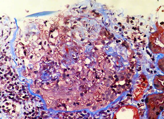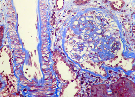 Figura 8. Tricrómico de Masson, X400. Hipercelularidad endocapilar.