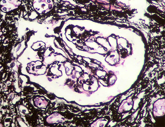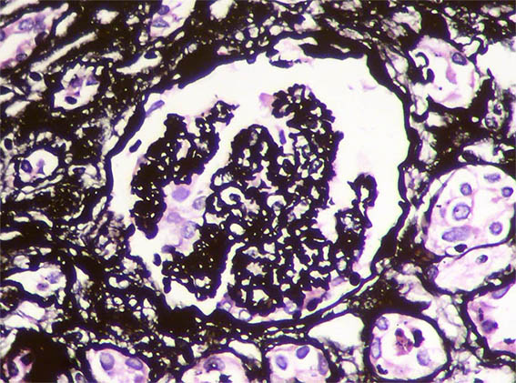 Figura 7. Plata-metenamina, X400. Mesangiolisis.