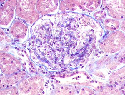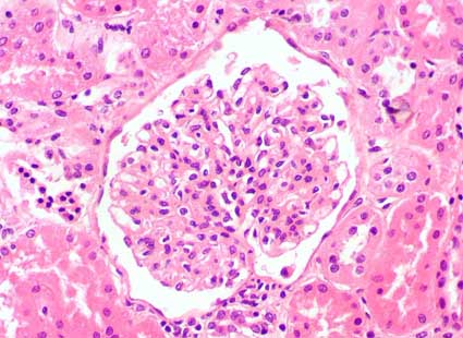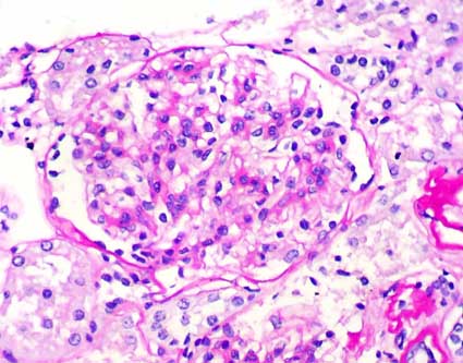 Inmunofluorescencia directa para IgG (izquierda): depósitos mesangiales