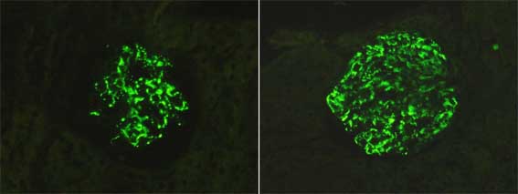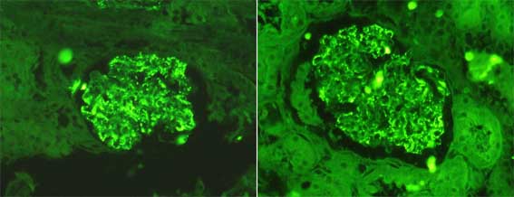 Inmunofluorescencia directa para cadenas ligeras Kappa (izquierda): depósitos