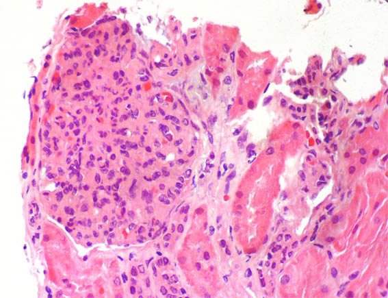 34 mL/min. Uroanálisis: proteinas: 300 mg/dL, 8-10 eritrocitos/CGA,