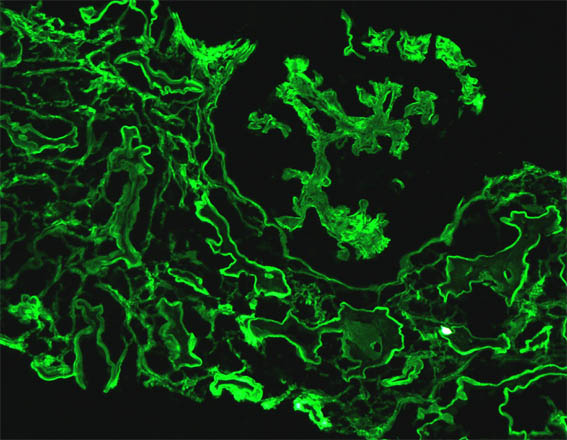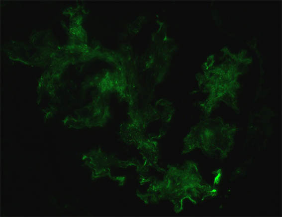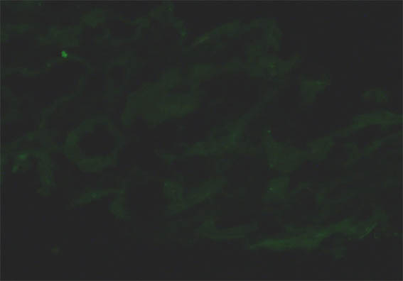 Inmunofluorescencia para cadenas ligeras kappa, X400.