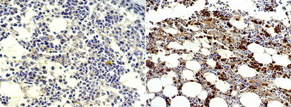 Figure 14. Inmunohistoquímica para cadenas ligeras kappa (izquierda) y lambda (derecha), demostrando la proliferación monoclonal de células plasmáticas. X400.