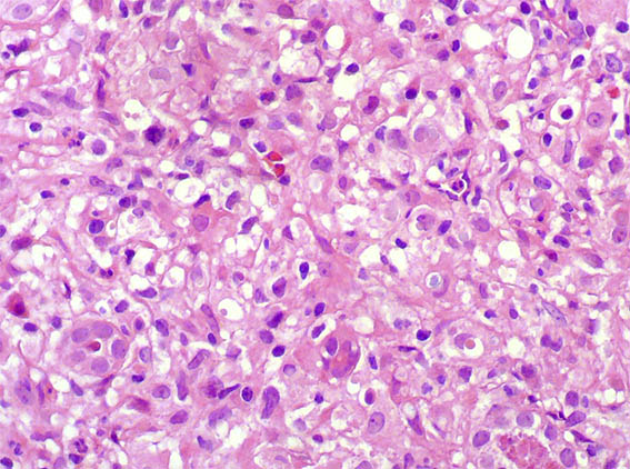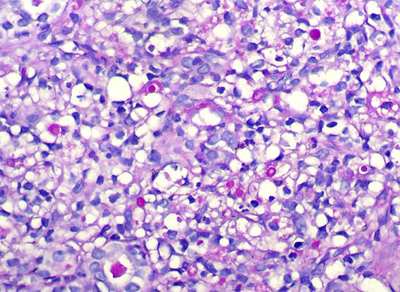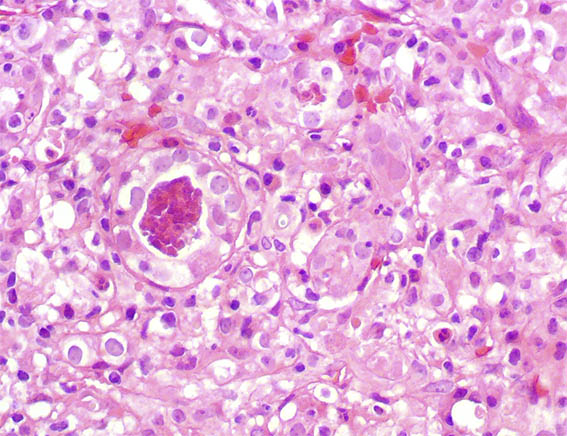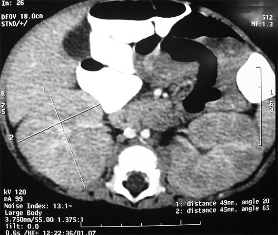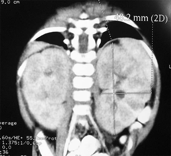 A five month-old girl presented with symptoms of malnutrition and severe urinary tract infection, with signs of sepsis and acute renal failure: serum creatinine 1.4 mg/dL. Both blood and urine cultures were positive for Escherichia coli, and antibiotic therapy was started. Severe, almost symmetrical, bilateral nephromegaly was evident on computed tomography (Figures 1 and 2). Voiding cystourethrography showed no urinary tract abnormalities.
