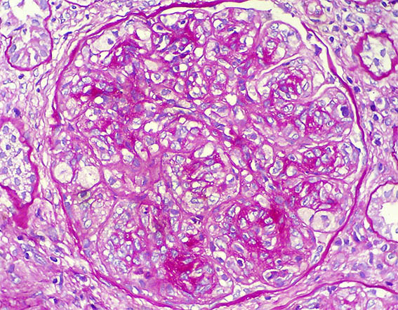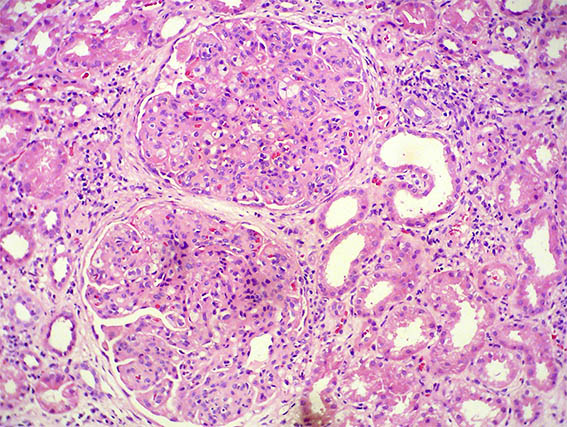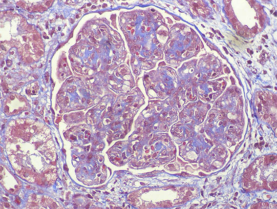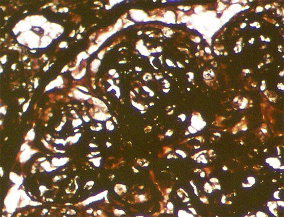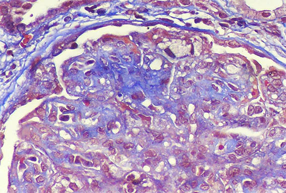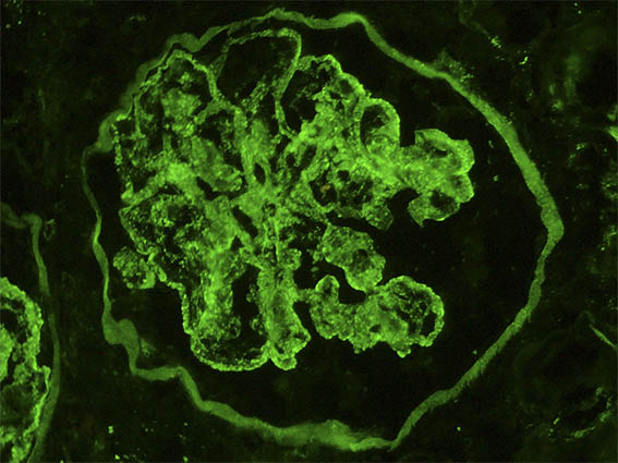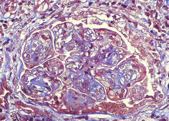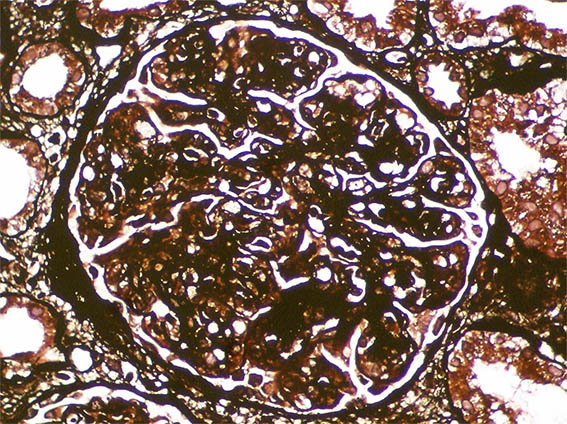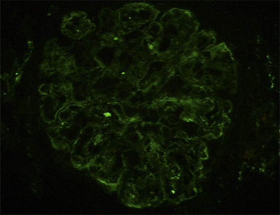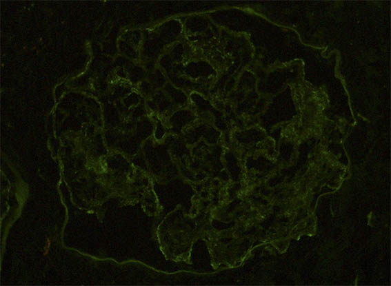 Paraclinical: Hb 10, Ht: 30.5, leukocytes and platelets: normal. Hepatitis B and C and HIV: negative, VDRL: not reactive. Normal protein electrophoresis. Serum immunoelectrophoresis: no monoclonal peak. Serum creatinine 1.9 mg/dL, BUN 48 mg/dL. Proteinuria in 24 hours: 9.2 grams. Serum albumin 1.9 g/dL. ANA and anti-DNA: negative; anti-Ro, anti-La, anti-Sm: normal values. C3: 25 mg/dL, C4: 6.5 mg/dL..