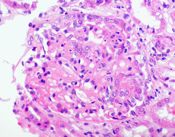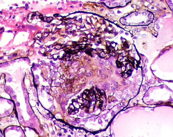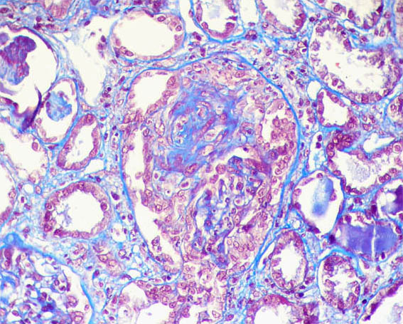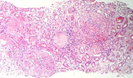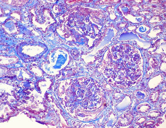 Laboratory tests: serum creatinine 3.5 mg/dL; BUN 52 mg/dL; PCR 8.1, ESR 48. Leukocytes 10,500, neutrophils: 93%, lymphocytes: 3%, platelets 194,000. Hb 10.4 Hto 31. Uroanalysis: density: 1.010, pH 6, proteins 500 mg/dL, nitrites: negative, erythrocytes 21-30/hpf, leukocytes 10-20/hpf. Uroculture: negative. Renal Doppler echo: increased cortical echogenicity, resistance index: 0.65, no thrombosis or stenosis. ANAS, anti-DNA and ANCAs: Negative. C3 and C4 serum levels: normal.