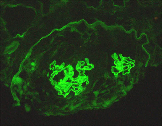 Figure 8. Another image of direct immunofluorescence for IgG, X400.