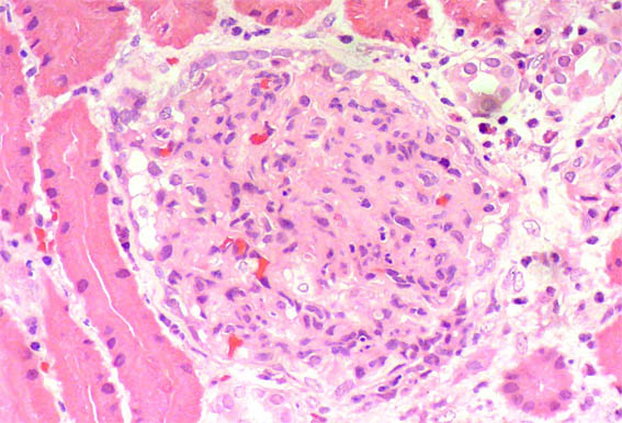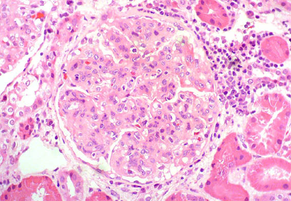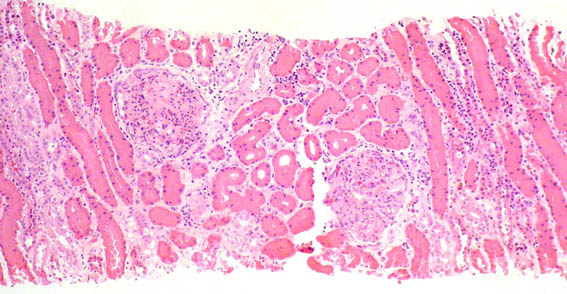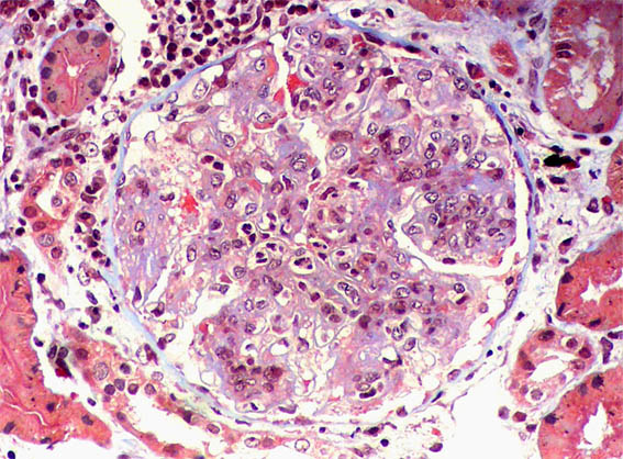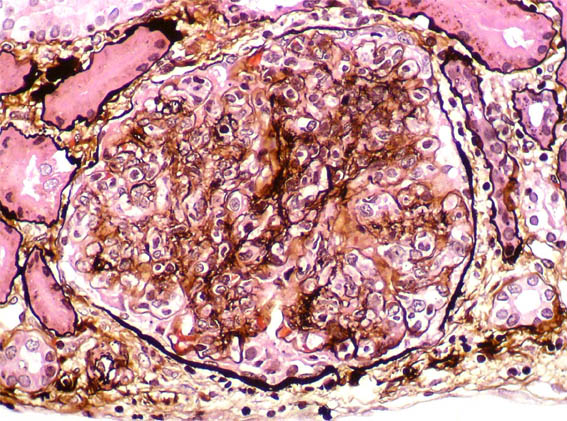 The patient: A 32-year-old man, with a recent diagnosis of HIV infection, without AIDS and without antiretroviral treatment. He consulted the doctor for lower limb edema and general malaise. He did not report alterations in the previous weeks. There was high systemic blood pressure: 150/95. No alterations in skin. Physical examination without other alterations. Laboratory tests: serum creatinine: 1.6 mg/dL, BUN: 22 mg/dL. Total serum proteins and albumin: normal. Uroanalysis: Proteinuria 200 mg/dL, microhematuria, without casts. ANA, anti-DNA and ANCA: negative. C3: 82 (90-180), C4: 12 (10-40). Full blood count: normal. Renal ultrasound: within normal limits.