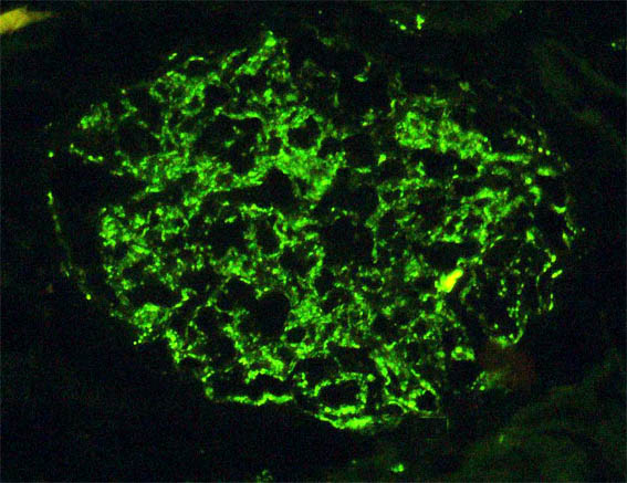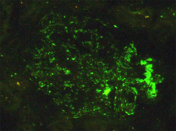 Direct immunofluorescence for IgA, IgM, and C1q: Negative; kappa and lambda staining with IgG-like staining.
