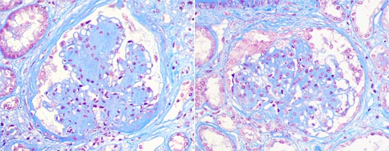 First post-transplantation biopsy. Left: Masson's trichrome stain, X400;