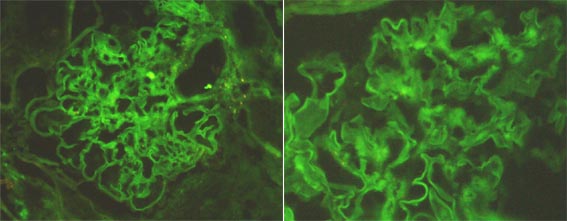 Immunofluorescence for albumin: positivity similar to IgG (Figure 7).
