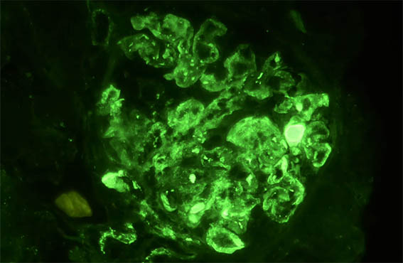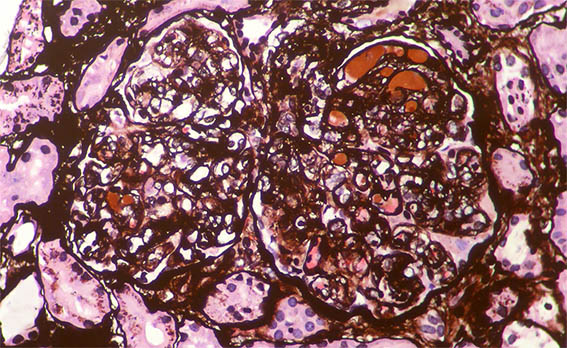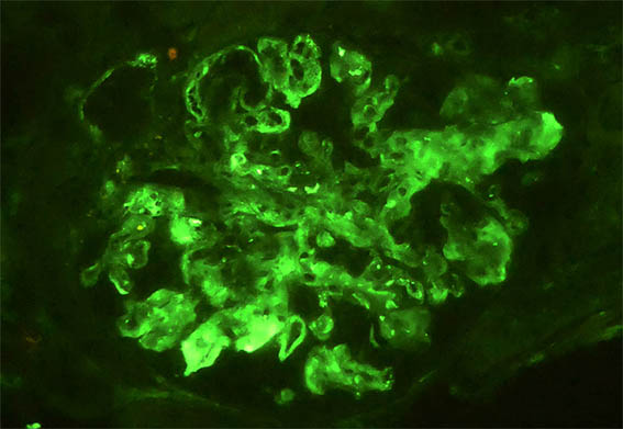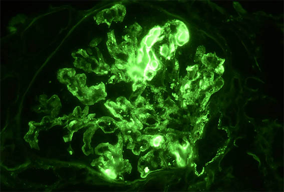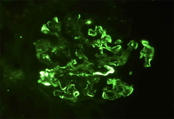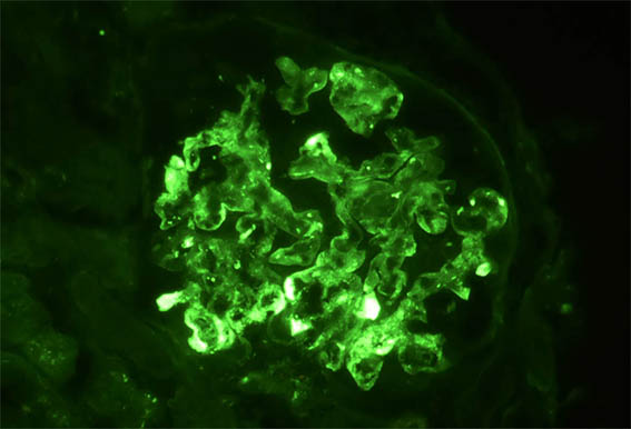 In paraclinical tests: Hb: 10 mg/dL, Hct: 31%, leukogram normal, platelets 320,000 mm2. Serum creatinine: 1.9 mg/dL, BUN: 28 mg/dL. C3: 82 (90-180), C4: 4.2 (12-40). ANAs and anti-DNA: negative; ANCAs: negative. Rheumatoid factor: >90 IU/mL (normal: <15). Studies for viruses: negative. Uroanalysis: proteinuria 300 mg/dL, red blood cells: 12/hpf, leukocytes 2-3/hpf, without casts or crystals. Proteinuria in 24h: 2.5 g; serum albumin: 2.9 g/dL.