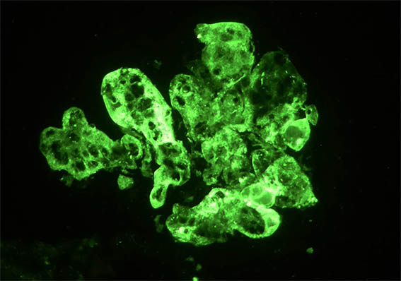 Figure 11. Direct immunofluorescence for IgM, X400.