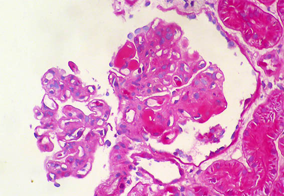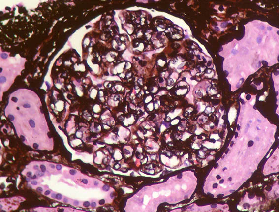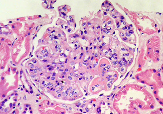 Figure 1. H&E, X400. Note the lobulation and hypercellularity, mainly mesangial in this image.