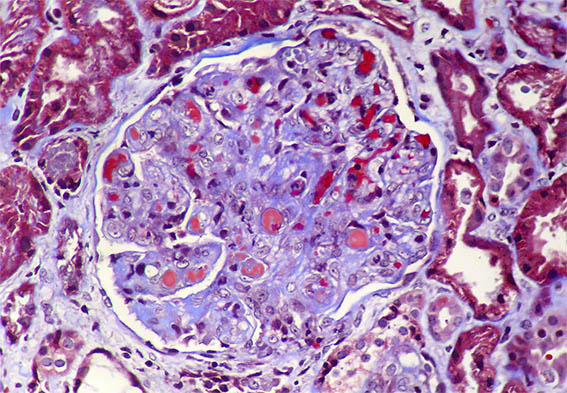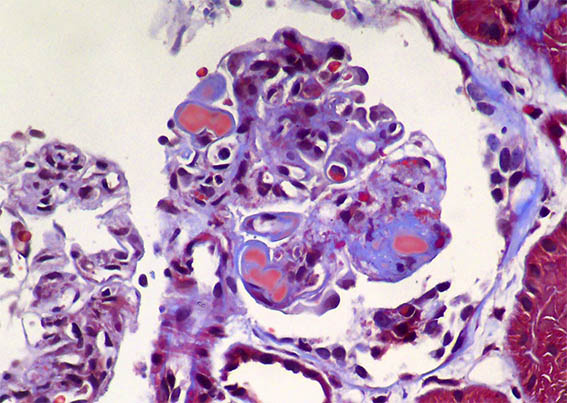 Figure 3. Masson´s trichrome stain, X400. Identify intracapillary hyaline material (misnamed "hyaline thrombi").