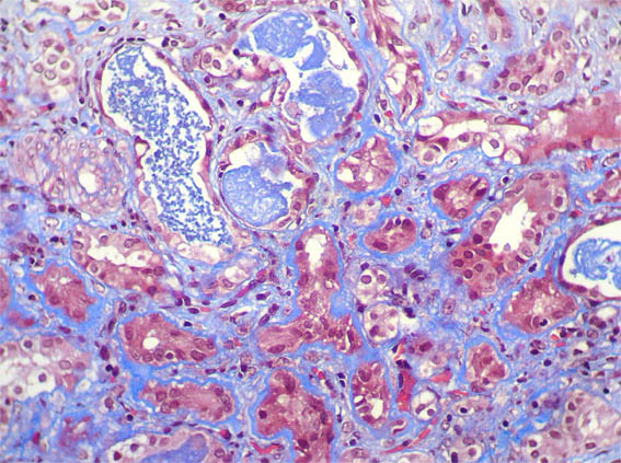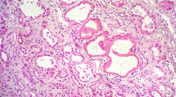 Urinalysis: granular casts, proteinuria 500 mg/dL. Proteinuria in 24 h: