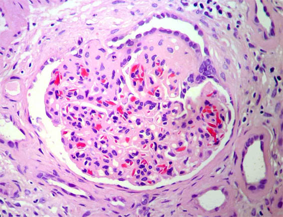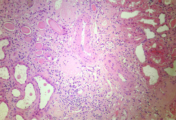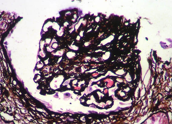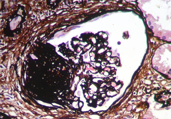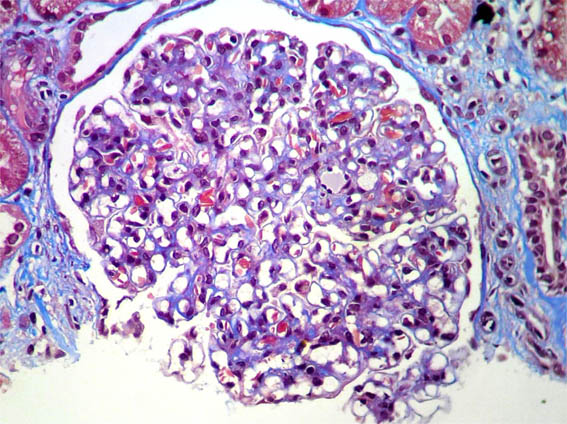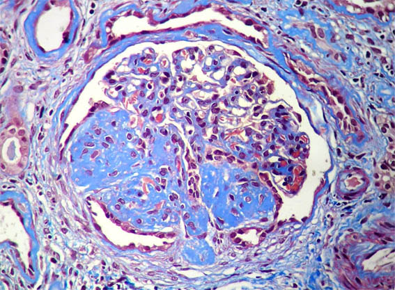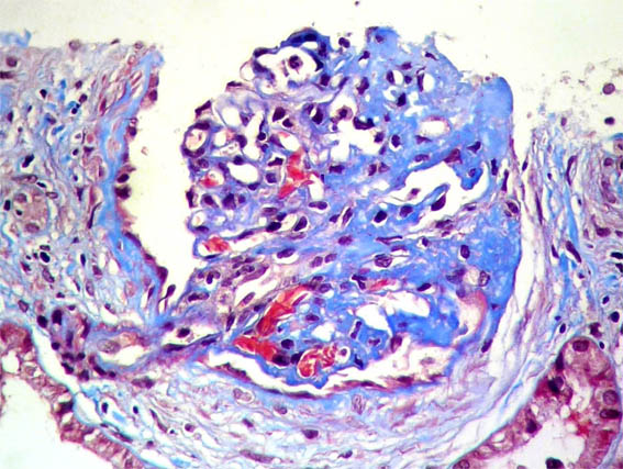 Laboratory: Hb 9.6 mg/dL, hematocrit 29%, platelets: 225,000, normal coagulation tests. Cr: 1.5 mg/dL, BUN 49 mg/dL, Cr clearance 43 mL/min. Proteinuria in 24 hours: 9.8 grams. Total cholesterol 184, triglycerides 281. ANA and ANCA negative, complement: normal. Normal liver function tests. HIV and hepatitis virus: negative. Urinalysis: protein 500 mg/dL, erythrocyte 8-10 HPF, without cylinders.