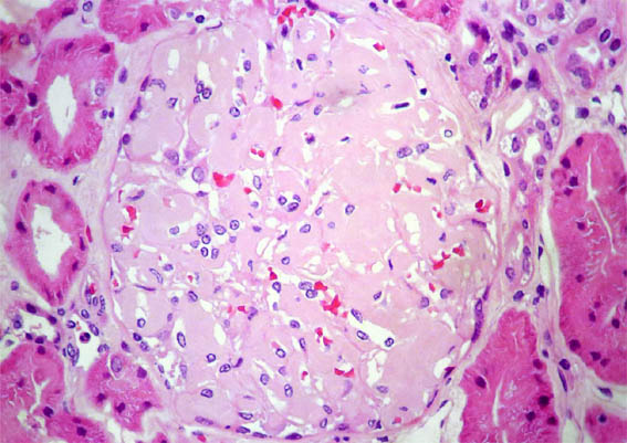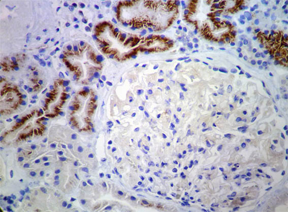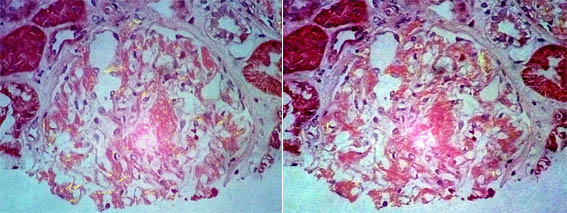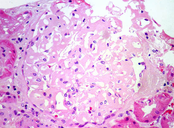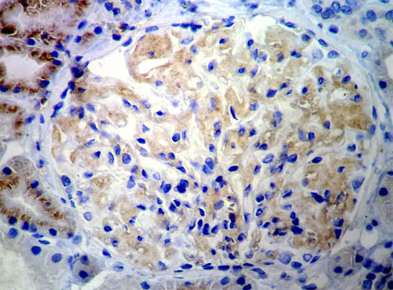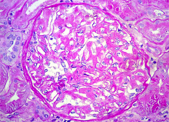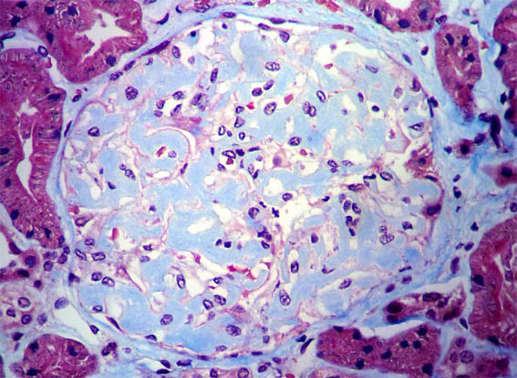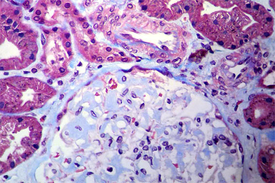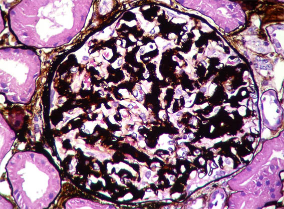 The patient is a 67-year-old man with lower limbs edema for about a month. Complete nephrotic syndrome was documented. Serum creatinine 1.2 mg/dL, BUN 27 mg/dL, Hb: 10 mg/dL, hematocrit 29%, platelets and white blood cell count were normal. Studies for autoimmunity and viruses were negative.